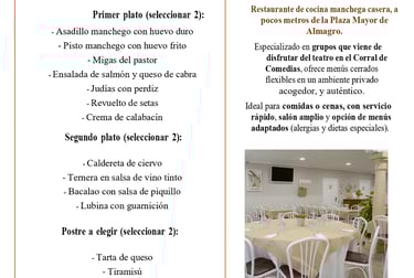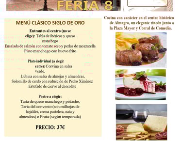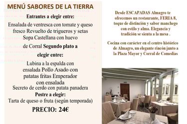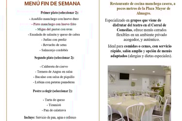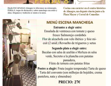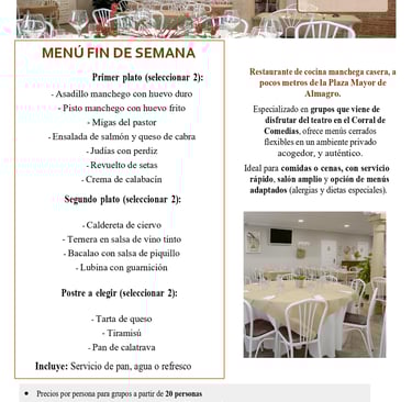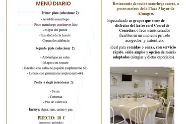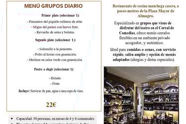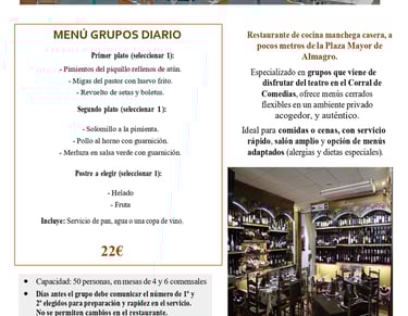 Cocina manchega actualizada con producto local, raciones para compartir y menús a medida. Ambiente cercano, servicio ágil y ubicación ideal para completar tu visita a Almagro.