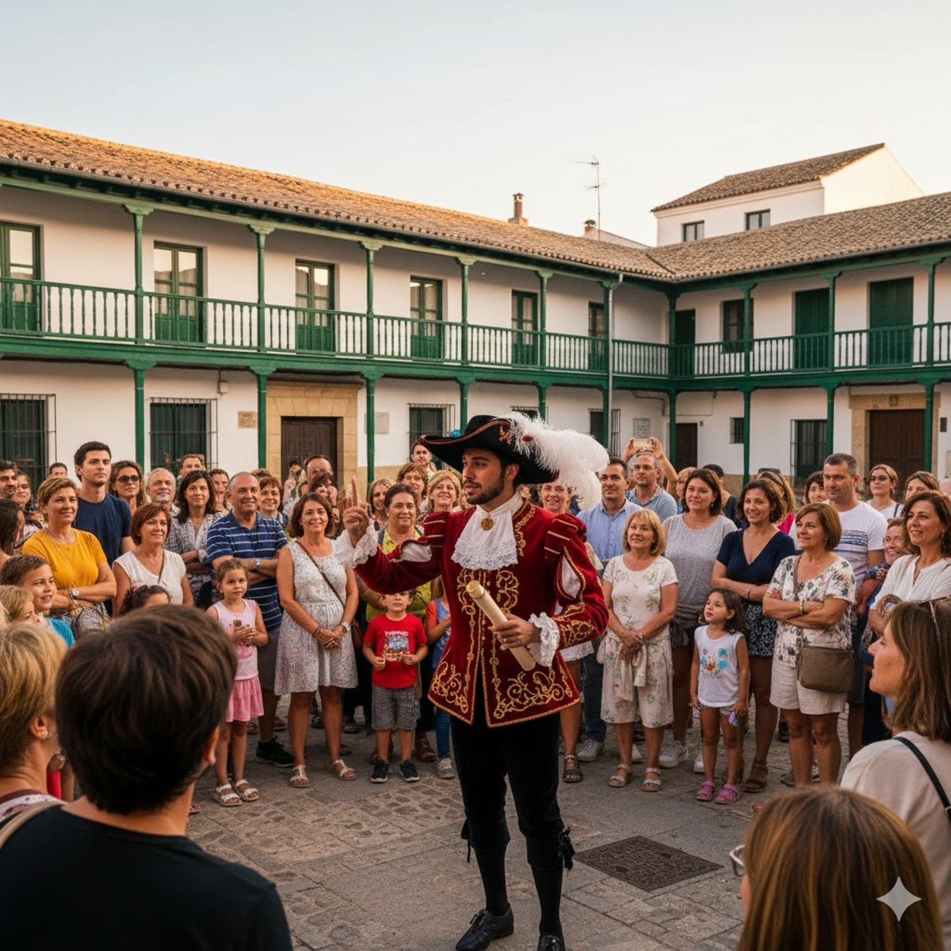 Un viaje interactivo y lleno de humor, donde tu "Guiactor" te acompañará a través de los rincones más emblemáticos de Almagro. Prepárate para conocer a figuras como el peculiar Fray Junípero, con una "gracia divina" para viajar en el tiempo, quien revelará los secretos y curiosidades de la villa con un estilo único y lleno de giros. Vicente Nové, en su papel de único actor, da vida a múltiples personajes que harán que la historia cobre vida ante tus ojos.