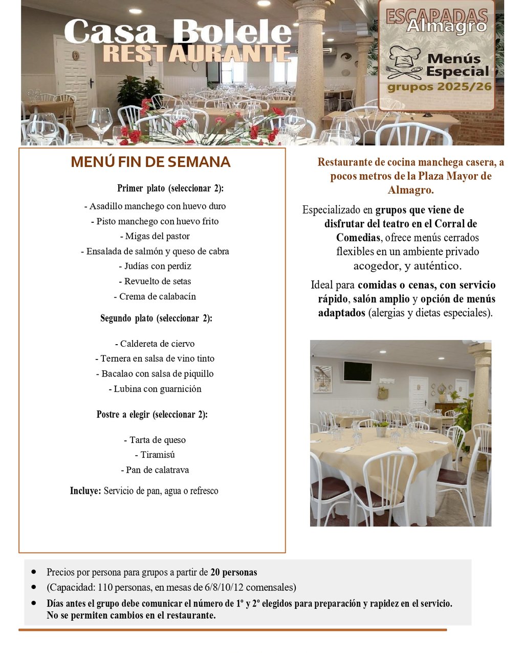 Tras la visita, disfrutaremos de una deliciosa comida en uno de los mejores restaurantes de Almagro, donde se degustará un menú típico de la cocina manchega.