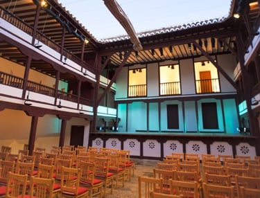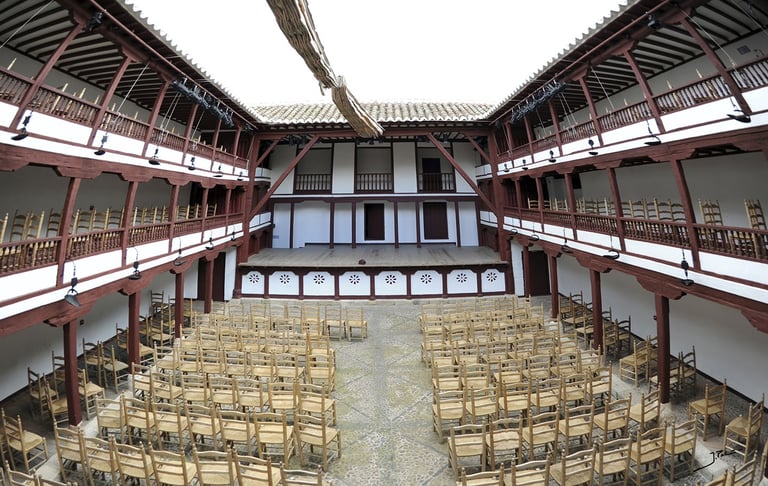 Atravesamos las puertas del CORRAL DE COMEDIAS, único espacio existente de la tipología de teatros del siglo XVI y XVII que conserva su estructura original.